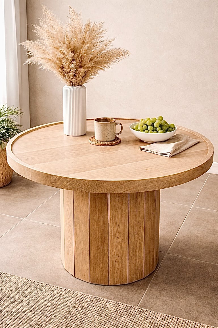 Okrągły blat z subtelnym rantem podkreśla formę i nadaje lekkości, a masywna podstawa zapewnia stabilność i wyrazisty charakter. Naturalne wykończenie eksponuje unikalne usłojenie – każdy egzemplarz jest niepowtarzalny.